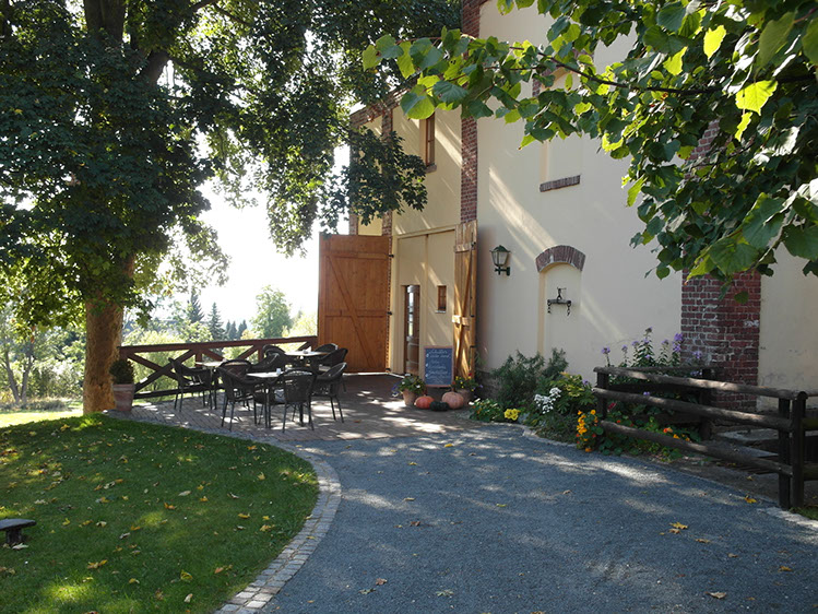 Einen schönen Blick hat man zu jeder Jahreszeit aus den großen Fenstern des Café's über das Elstertal.